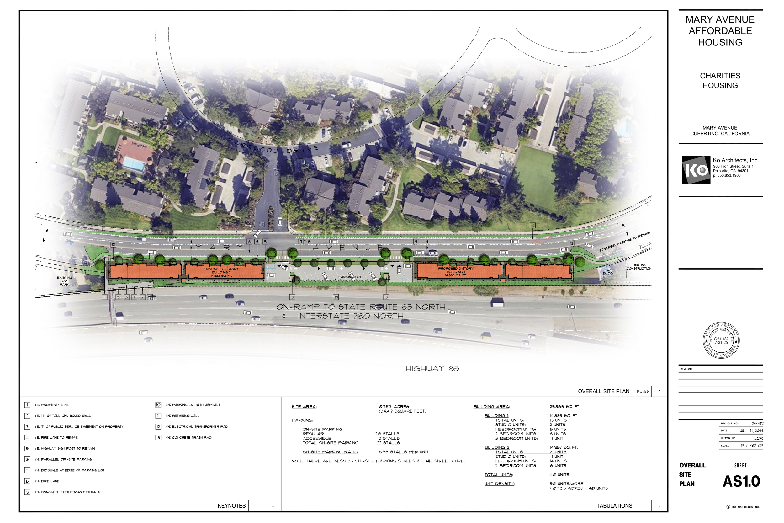 Mary Avenue Villas is a 40-unit, 100% affordable housing community in Cupertino, California, developed by Charities Housing in partnership with the Cupertino Rotary and Housing Choices Coalition. Situated on a 0.79-acre long, narrow lot adjacent to Highway 85 and Mary Avenue Dog Park, the project features (2) two-story, wood-framed buildings, each equipped with its own elevator. An at-grade parking lot will be centrally located between the buildings. The development will offer a diverse unit mix, including studio, one-bedroom, two-bedroom, and three-bedroom apartment units to accommodate various household needs and targeted population. The current design will include a Community Room for the residents, as well as an office, and meeting spaces for resident programs and services.